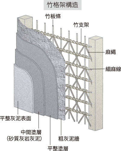 灰泥是構成城牆的多層建築材料的最後一層。建築師使用一種被稱為板條的木竹格子狀框架開始建造工作,然後,將泥漿塗抹在框架上面形成牆體——在姬路城的建造過程中,總共需要塗抹四層泥漿。乾燥後,工匠用兩層灰泥為泥漿覆蓋,每層灰泥均由略有不同的材料製成。